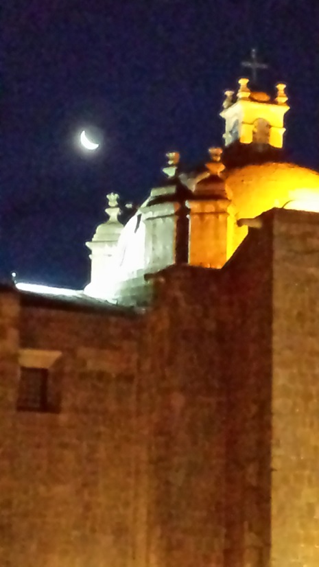 Puno spreads up a hillside in sectors that join along the lake. That means that the walk to almost anywhere is uphill, so we huff and puff from place to place. The cathedral is nicely lit at night, and I could see the crescent moon behind it.