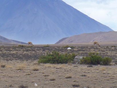 Within an hour of leaving Arequipa we found ourselves in the puna, high altitude grassland that stretches for miles up to the Misti volcano that overlooks Arequipa. Part of this area is a reserve for vicuna and guanaco, the wild relatives of llama and alpaca. I thought Jonathan was kidding when he said, “There’s vicuna, pull over!” We watched the six animals graze for a while. Later we saw mixed flocks, mostly alpaca, but also the occasional sheep, cow and perhaps llama or guanaco. We saw a sharply variegated black and white hawk and Chilean flamingos wading in shallow lakes.