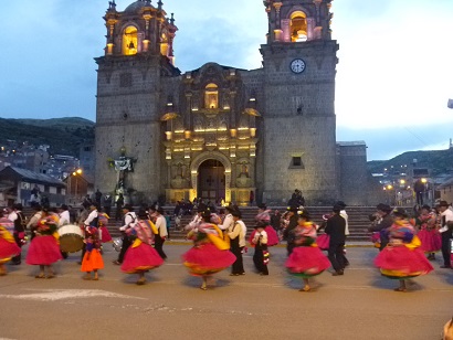 We arrived in Puno around 2:30 pm and were resting by 3. We benefitted from our two days in Arequipa but Puno is 3850 m, about 1500 m higher than Arequipa. You pant going up stairs, sometimes your fingers and toes tingle and you have a slight headache. I hope this will pass overnight. We walked down to the Plaza de Armas and found a pasacalle in full swing. A man carrying a decorative banner announcing the group led men wearing black and white and playing Andean flutes that look like oversized recorders. Beside and behind came two rows of women dancing and whirling in traditional highland multitiered skirts, pollera, singing along with the music. Two women led, marked by wearing many more skirts than the others. The group danced their way around the Plaza, past the cathedral, down the street and away.