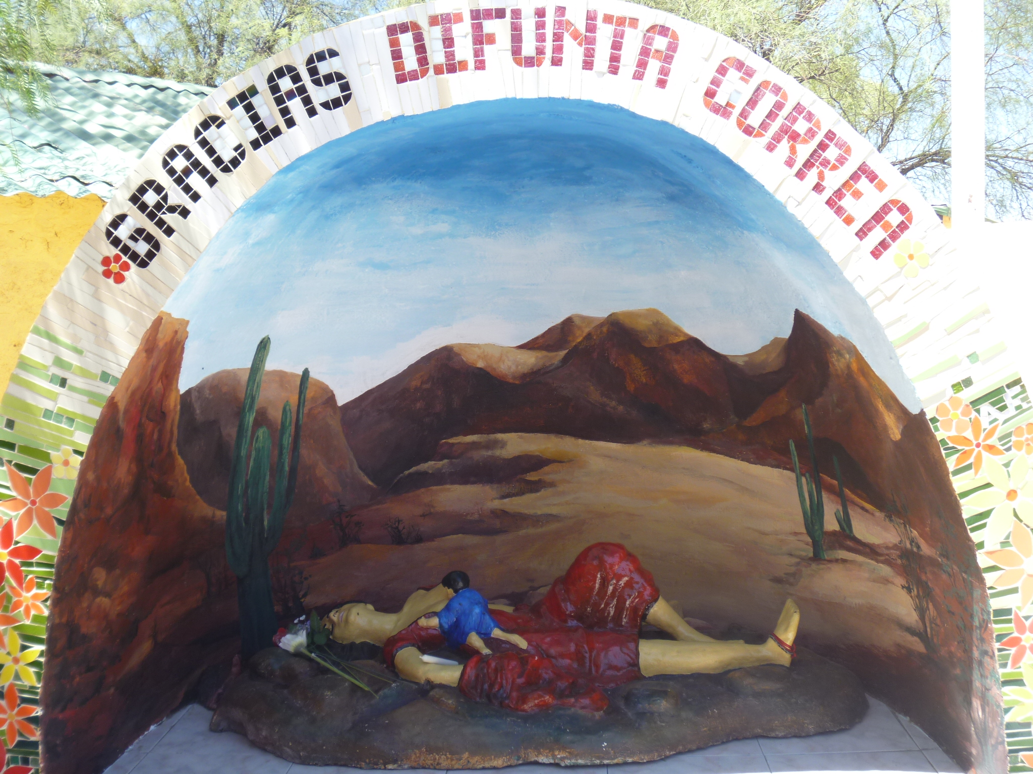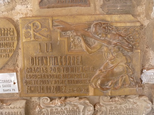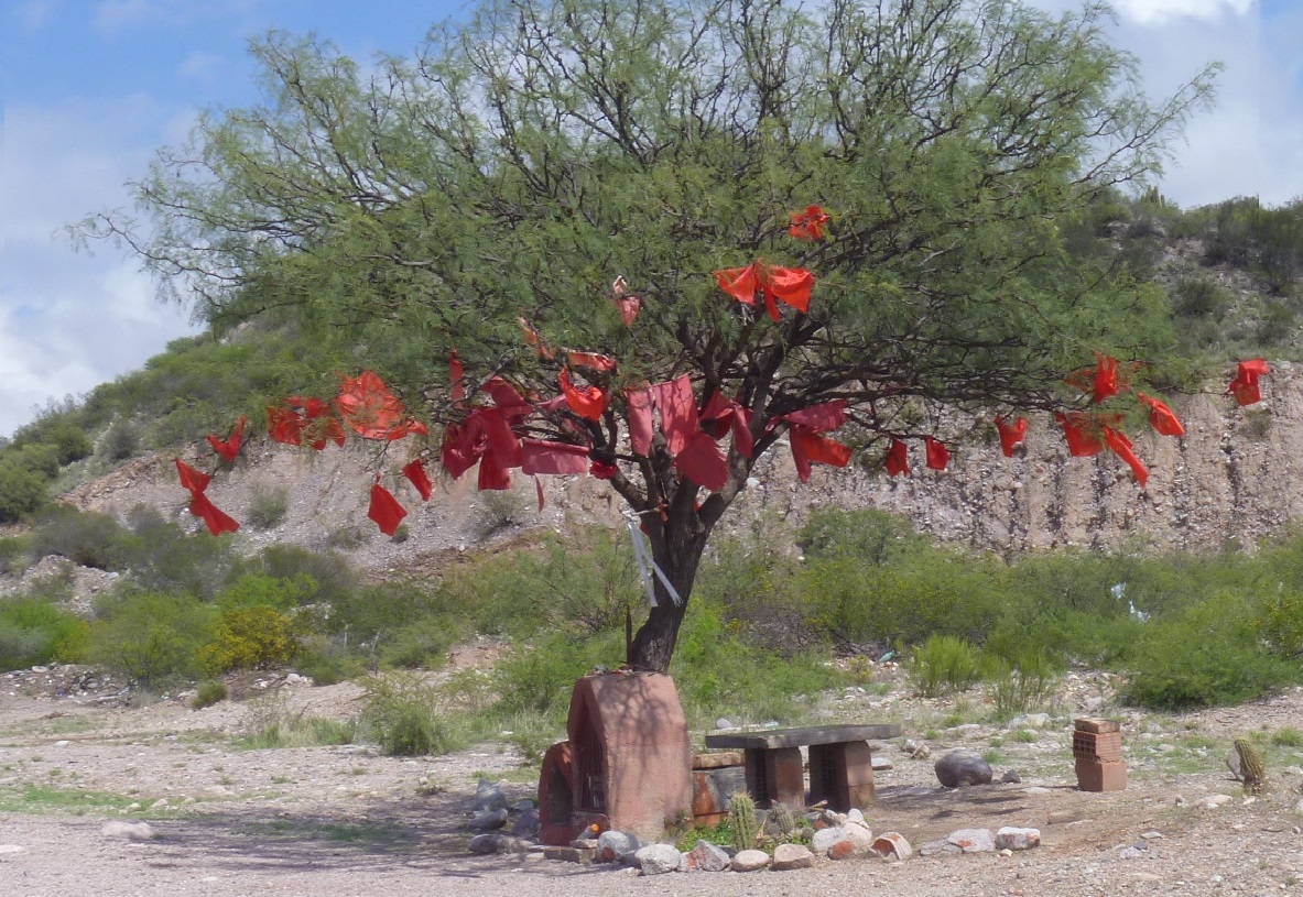 On the way into San Juan, we stopped at Vallecito, home of “La Difunta Correa”. The story goes that in the mid 1800s, Sra. Deolinda Correa followed her husband as he went off to battle, impressed into service as was common at the time. Sra Correa died of thirst on the trail, seeking her husband, but her baby survived by nursing its dead mother. Since that time, La Difunta Correa has become the patron of travelers, though her status has not been confirmed by the Catholic church.