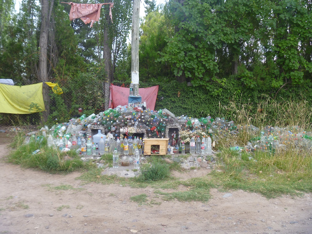 Travelers give gifts of water bottles to the difunta at roadside shrines. Some have hundreds of bottles. The main shrine goes far beyond water bottles. Plaques created in gratitude for safe travels cover the sides of several structures, and gift range from paintings and sculpture to wedding and christening dresses, trophies, toys, and a room full of model trucks, each emblazoned with the name of a transport company seeking safe travels. The site covers about an acre and at least 5 times that area is covered by picnic areas, barbeque grills, bus parking and other amenities. There could be thousands of people visiting at one time, though there were only about ten people there while we were at the shrine. Here is a roadside shrine to la difunta: