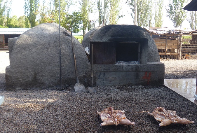 Tempranillo. This was tempranillo with a small amount of sauvignon blanc intentionally to add a spicy flavor, which it did, almost a clove scent and peppery. Ricardo serves this at lunch with salami, and when we were interested, he sent us down the road to the guy he buys his salami from. We saw a row of salamis and hams air drying, and the pigs about to be roasted. In 25 wood fired ovens, this farmer can roast 100 hundred pigs. I wondered what holiday would call for 100 roast baby pigs. The two going in to the oven looked to be about 15-18 lb each.