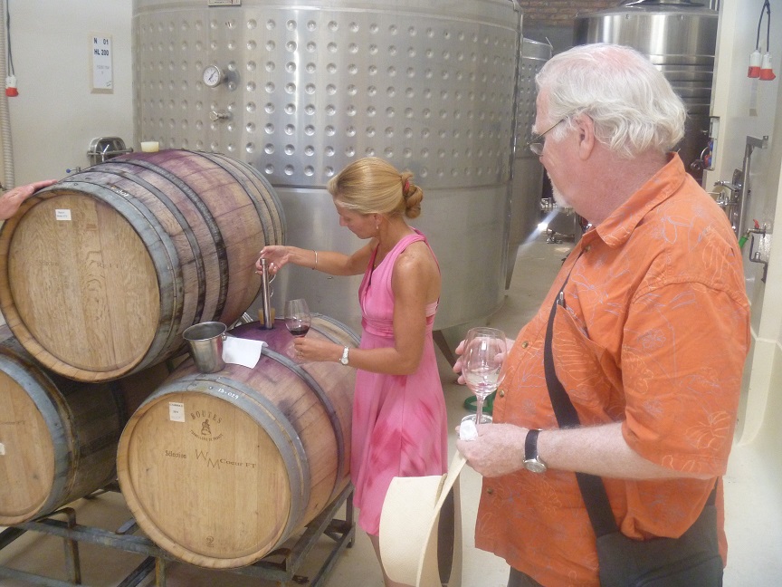 After lunch back at the apartment, we set off for Achaval Ferrer, a winery we’d heard of that seemed to not be very picky about reservations, and we could not find a phone number for them. We arrived around 3 pm, and were greeted cordially. They had both English and Spanish tours about to begin, and we joined the English group. A couple from Boston were there with friends from London, all very pleasant. Our guide, Cecelia, spoke English pretty well and was very knowledgeable about the vineyard. Unlike some others, Acheval Ferrer was begun by a consortium of 5 people who purchased existing vineyards and rehabilitated or reoriented their production. They own vineyards in three different zones, the area east of Lujan de Cuyo, the area we visited in Lujan de Cuyo and a slightly higher altitude vineyard that also is affected by volcanic ash. Most of their production is Malbec and we tasted a malbec from each of the three vineyards, two from barrels (pre-bottling–the wines age 12 months in bottles), one malbec blend.
