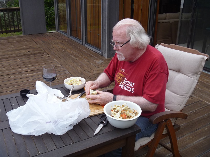 We bought a Dungeness crab on the road to Mendocino. Jonathan sat on the deck and cracked it.