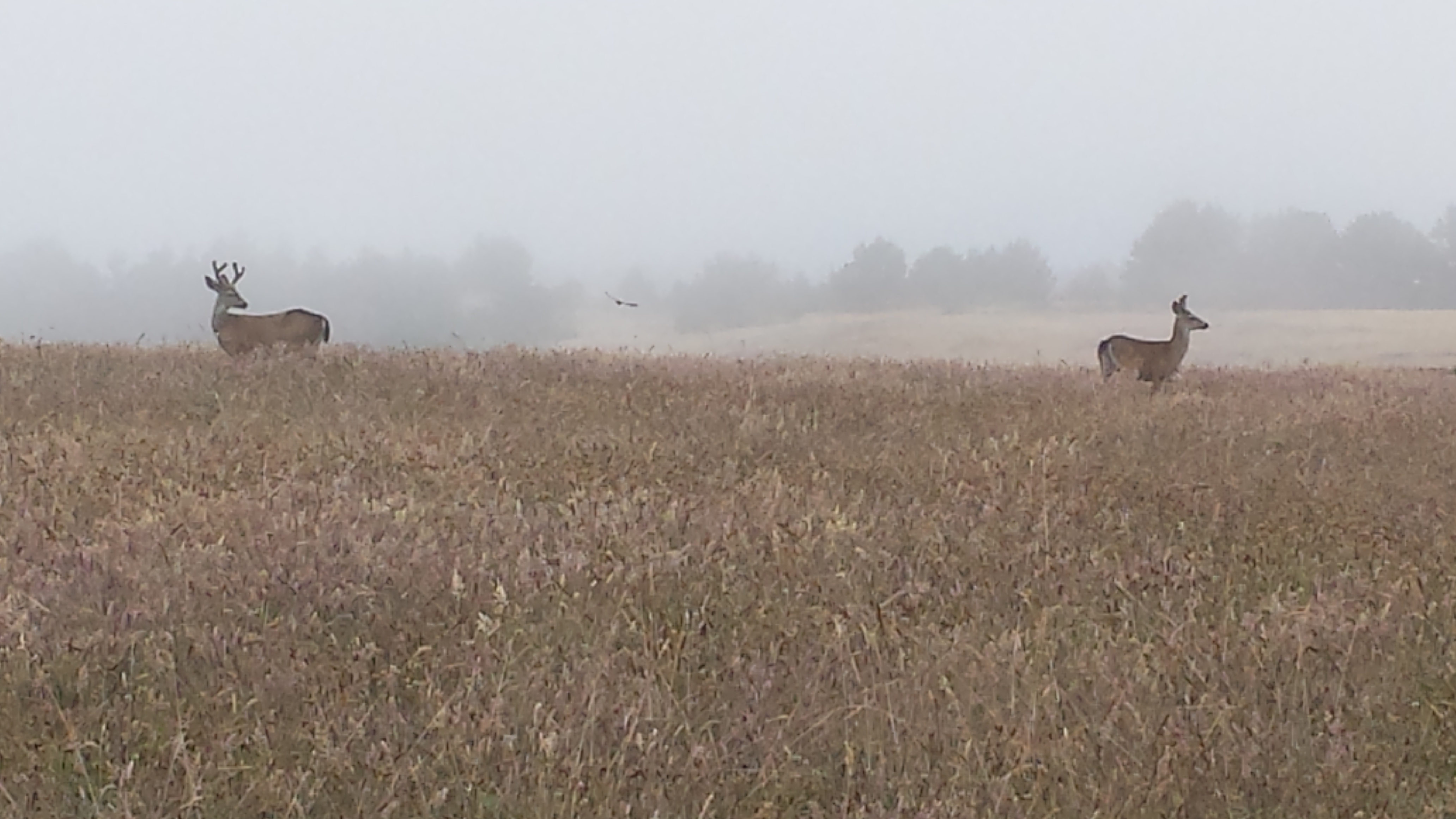 Further from the house, I came across this pair of deer grazing in the field near the cliff edge about half way between our house and Chapman Point on a misty afternoon. The stag seems to be checking that I’m not disturbing his doe. His antlers are still new and velvety.