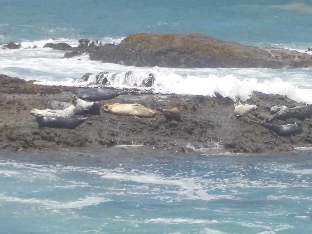 Harbor seals lounged on the rocks until the tide rose and pushed them off, then they flopped and rolled and skooched onto a slightly higher rock. There may be a sea lion mixed in with these guys, and even that molting elephant seal (palest colored animal) from the beach around the corner.