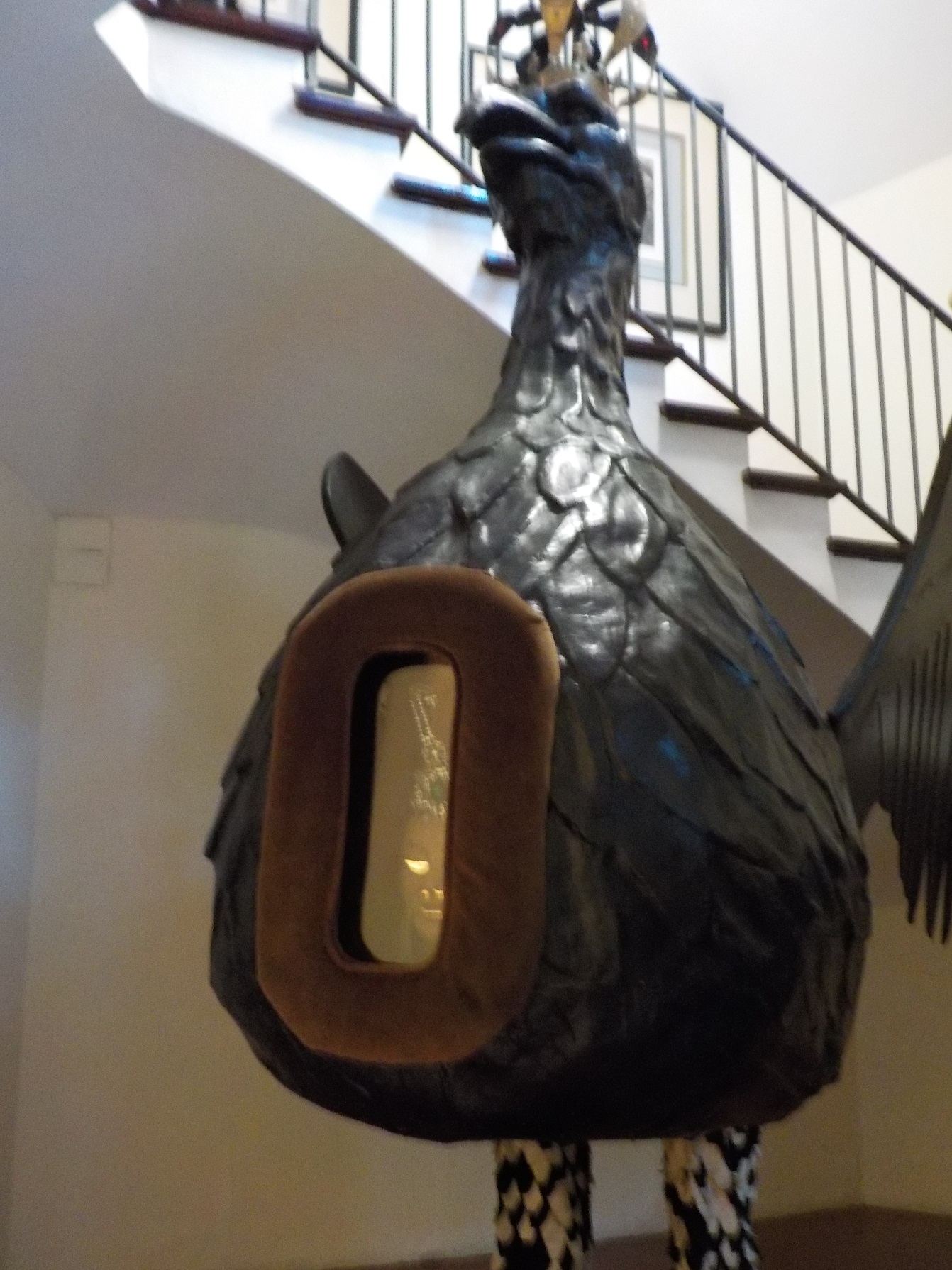 There are lots of quirky exhibits, like this African mask, embellished and placed in the stomach of a huge bird.