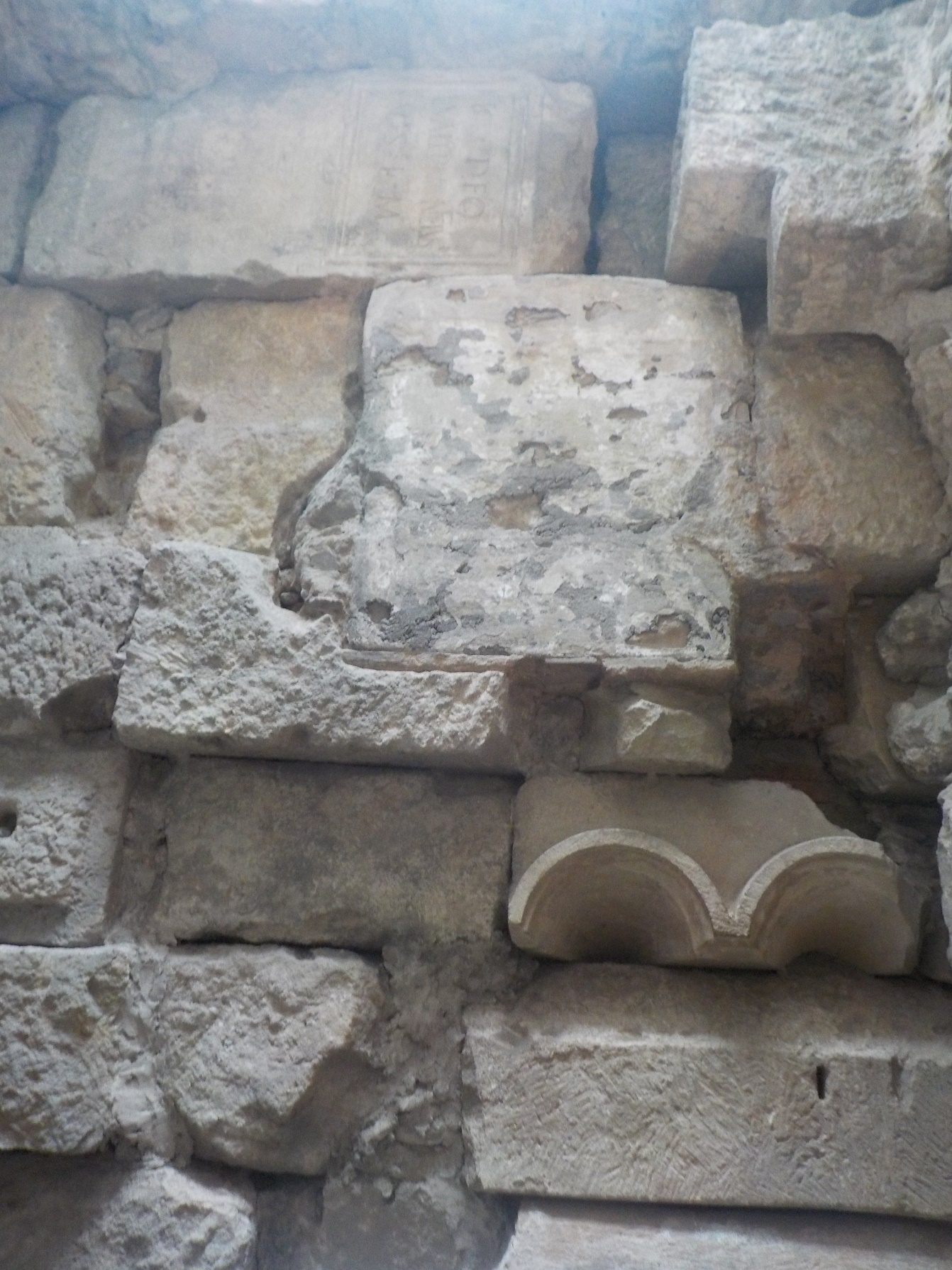 This wall of miscellaneous stone includes various shapes and one with a Roman inscription. Materials were reused over and over.