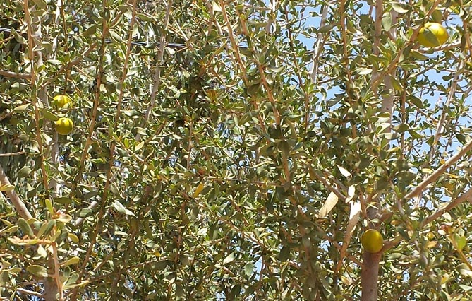 Cooperatives of woman formed to produce argan oil and related products can be found across southwest Morocco. On our drive from Agadir to Essaouira along the coast, we passed thousands of argan trees full of fruit, signs for cooperatives, and billboards referring to projects benefitting women. These all appear to be cooperatives to produce argan products. While cooperatives seem to help women, in the region we drove through there was no other visible employment of any kind. As we drove down the road, we passed stand after stand where vendors (men) held out bottles of argan oil and gestured to us. I subsequently read that many of these are probably adulterated products.