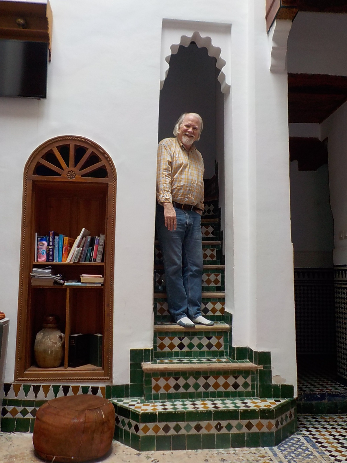 Steep stairs to upper rooms and roof terrace.