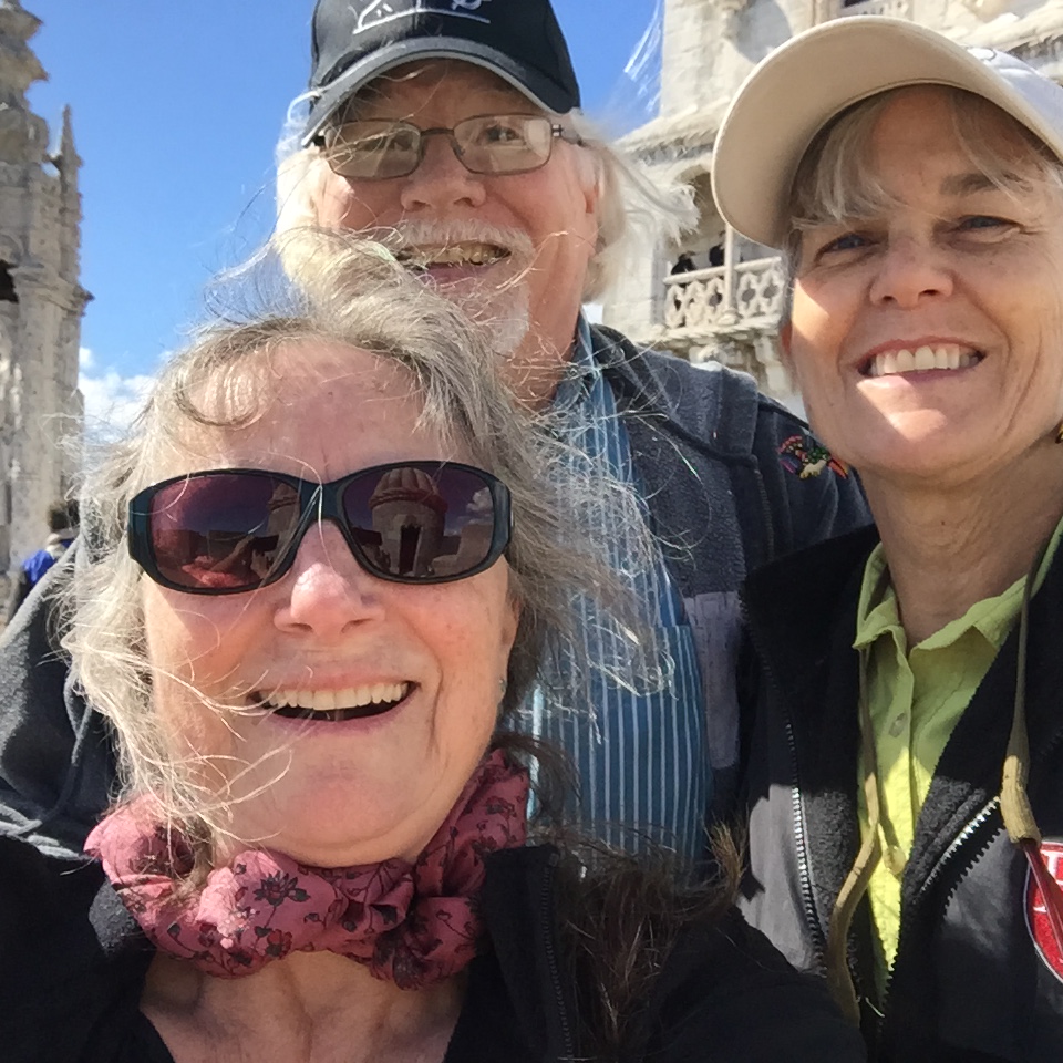Though much smaller, the Torre de Belem is equally ornate, crouched by the river with lots of cannons ready to defend Lisbon. The tower was paired with another on the opposite bank of the river at Sao Sebastiao, to defend Lisbon. This worked more or less well during a long and complicated history, but the tower has survived to the present. Long lines of visitors wait to come through the doors, descend to hit their head on the arches of the dungeon, and then climb to the upper floor for a view over the water. The sun broke out in the late afternoon in honor of our visit, making it beautiful.
