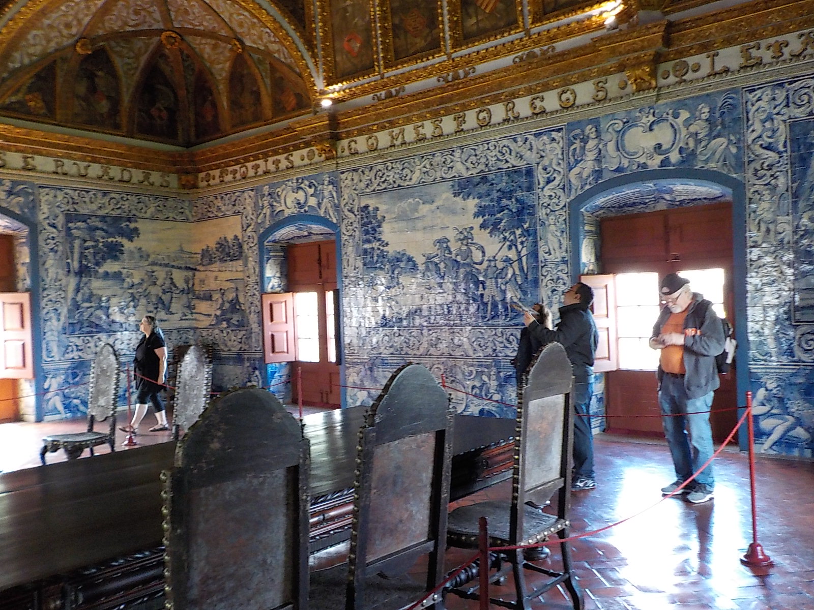 So far, we’ve only spent one day in Sintra, making inroads on a single palace, the National Palace of Sintra. The Palace dates from the 14th century and has been updated and remodeled over the centuries. The ceilings appear the oldest style, painted boards, yet what boards! There are magpies, swans, mermaids and a fleet of sailing ships.
