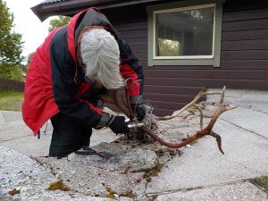 Beachcombing is not so simple in our area–most of the shore is rock. There are a variety of clams, whelks and we learned that little sand trails come from lugworms. (Amanda is our visiting marine biologist.) There is still a lot to look at when there is a sandy spot, and a surprising quantity of junk along the high tide line. Most of it probably washes in from boats, garbage escaping from the ferry, etc., but some is local. Originally, I said that the person who found a piece of narwhal tusk would be the beachcombing champion. After we arrived, I looked up narwhal and found they live in Canada and Greenland and are nowhere to be found in Norway. No narwhal for me. In any case, our first day walking along the rocky shore in Kjerstad, Jonathan took the prize for the entire Norway beachcombing season, by finding this: