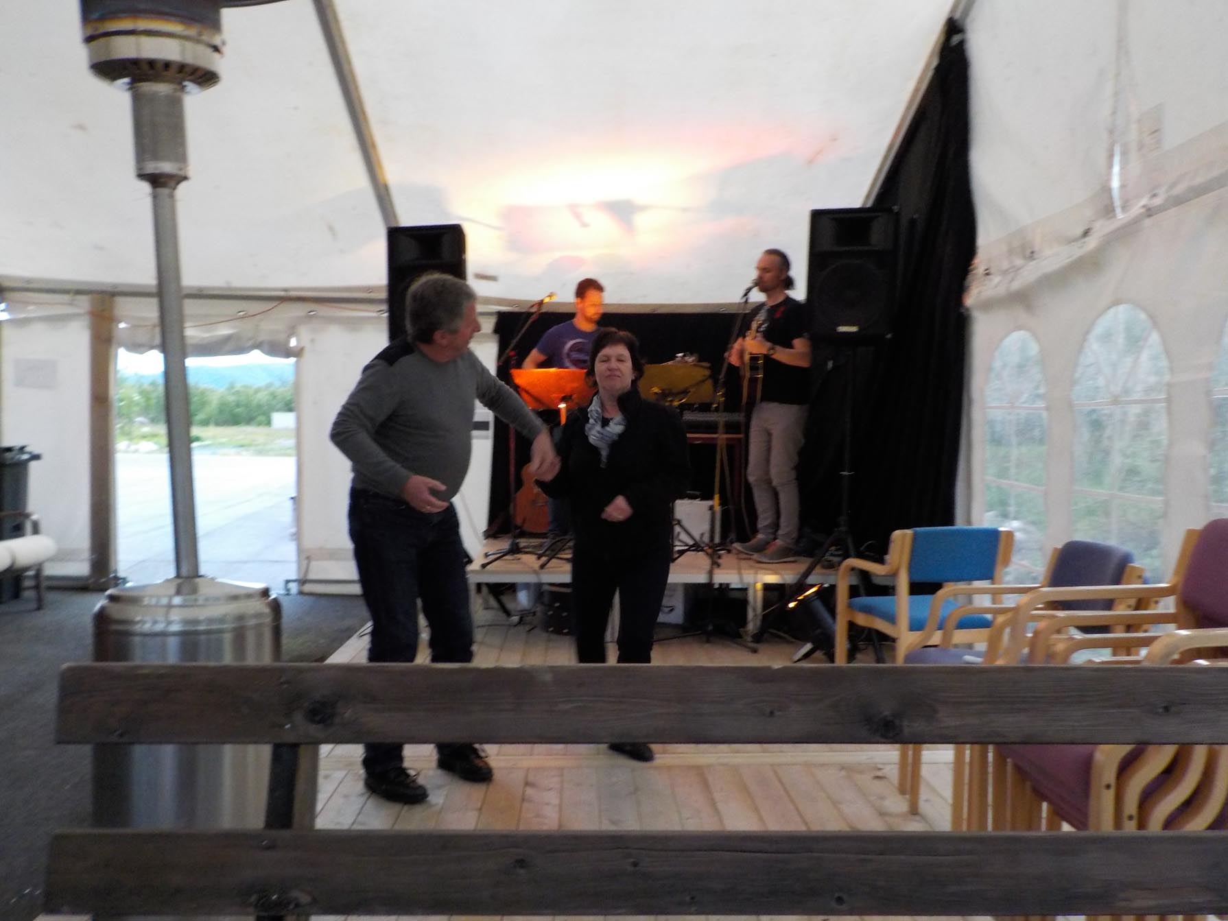 Last Saturday night was a pub night at the same place in Kjerstad, the community center. We were told it began at 9 pm, so we arrived at 9:30 pm. We were almost the first people there, but we got drinks and sat down and chatted with two men who turned out to be the musicians. Both are teachers in Harstad, one focusing on English though teaching other subjects, most recently to 6th graders. The other teaches a range of subjects to middle and high school students. They play for fun and pocket money. This was a last minute event for one or both of them. Someone cancelled somewhere along the way and one or both of them were a last minute addition. It didn’t matter to us because they were very good, playing bass and guitar and singing, mostly in English! The songs were familiar rock tunes. I’m sorry there was only one of these events during our stay.