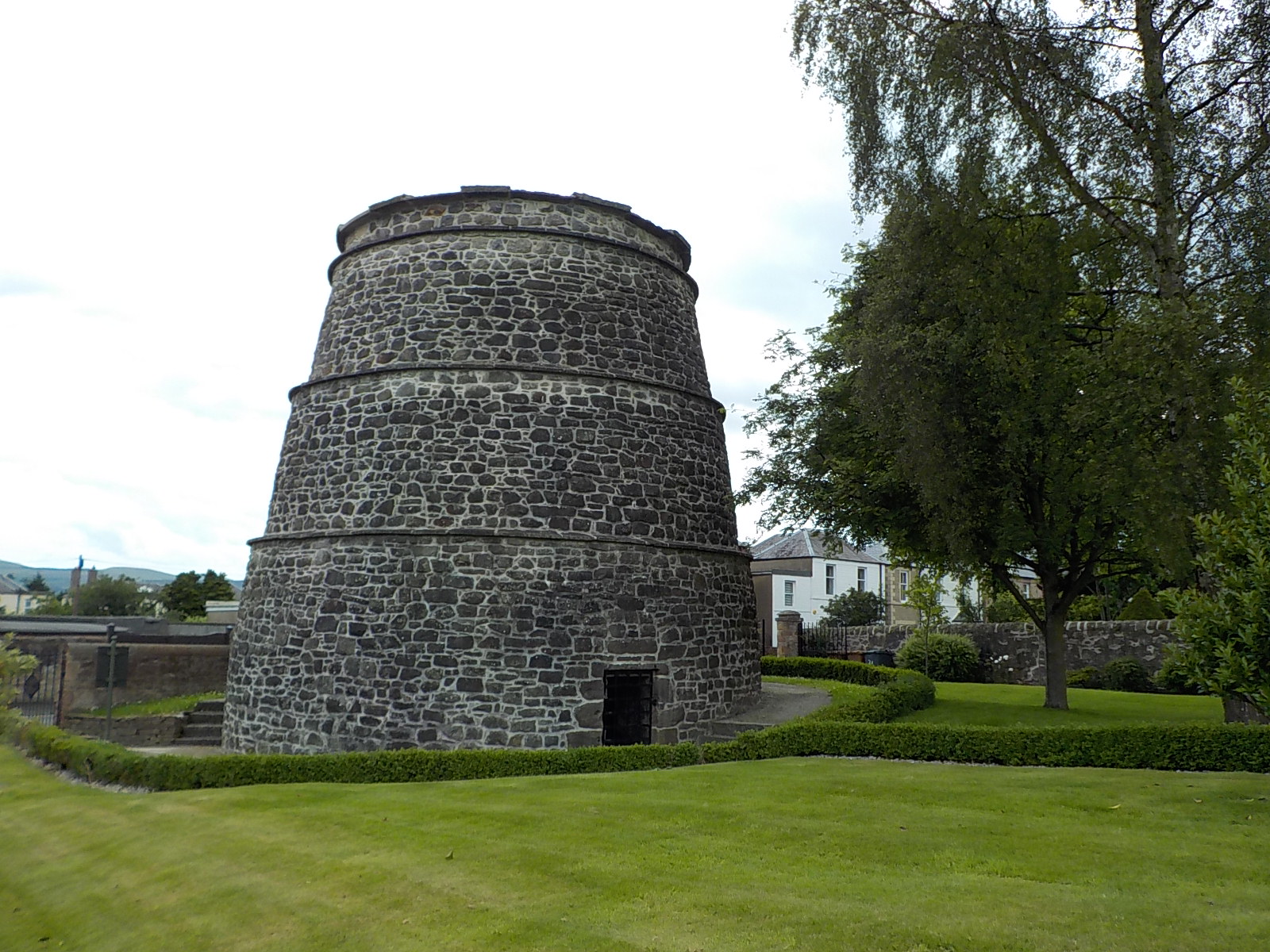 I visited this dovecote, and found it sitting in two adjacent front yards that neatly curve around halves of the structure. An informational sign suggests the structure avoided being demolished because of a local myth that anyone destroying a dovecote would be cursed.