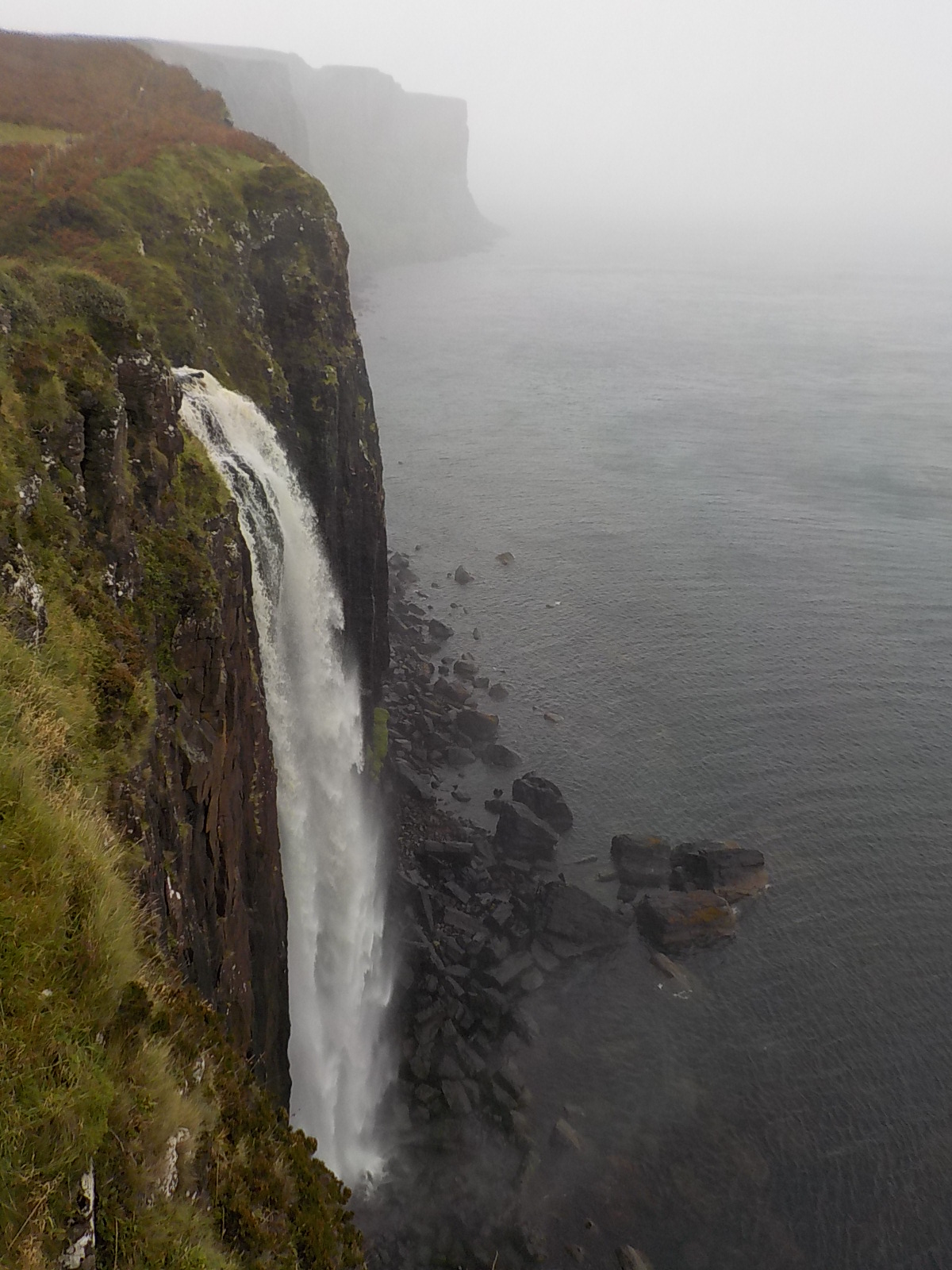 By the time we arrived at Kilt Rock, it was pelting rain sideways. One side got wet while we were rushing from the car to the overlook. The other side got wet when we rushed back to the car. The waterfall was gushing full force. Skye seems to have lots of water right now.