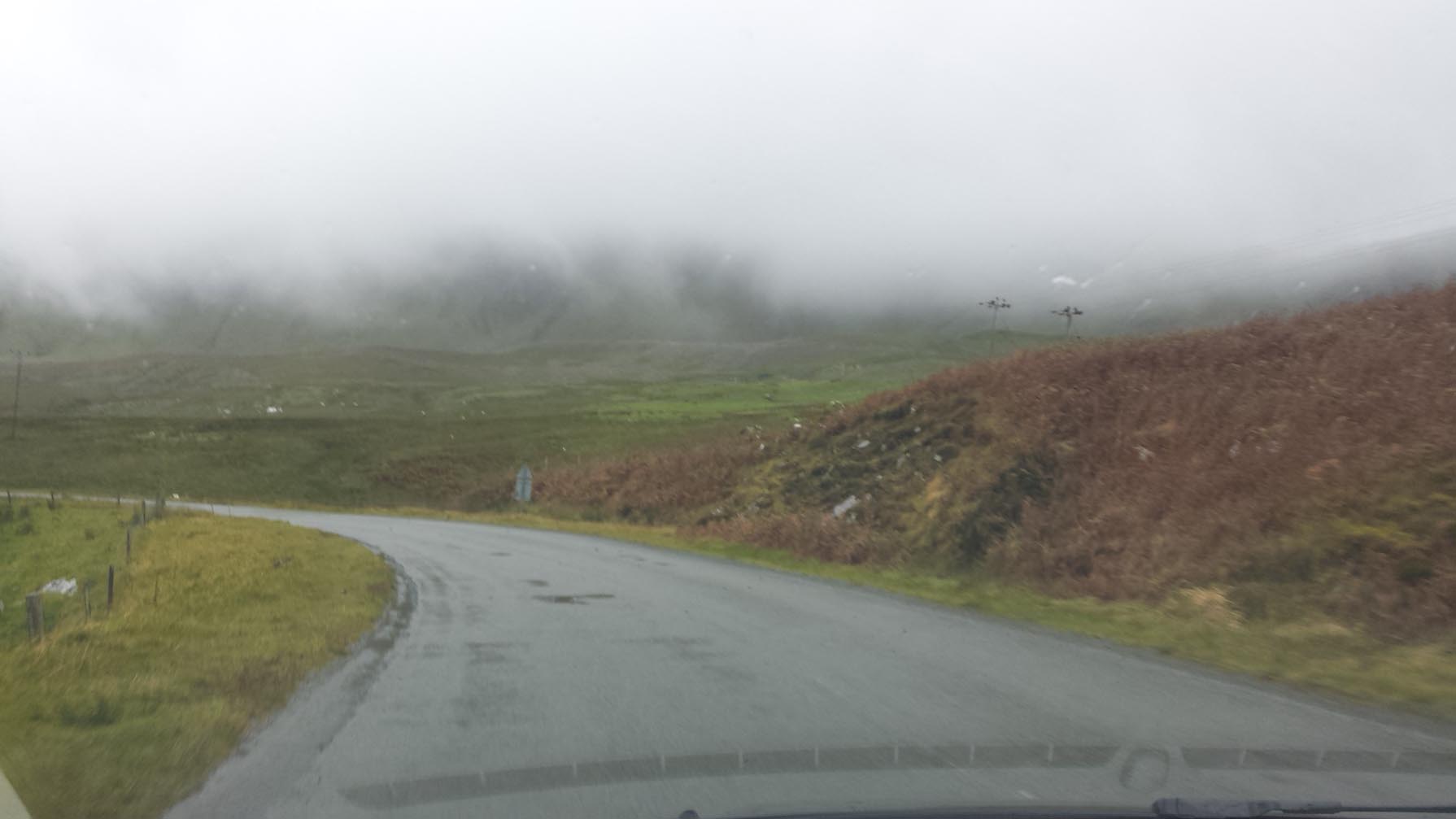 The Old Man of Storr was the final sight on our loop, but was totally obscured in mist. We saw it, but as gray ghosts, not as black pinnacles.