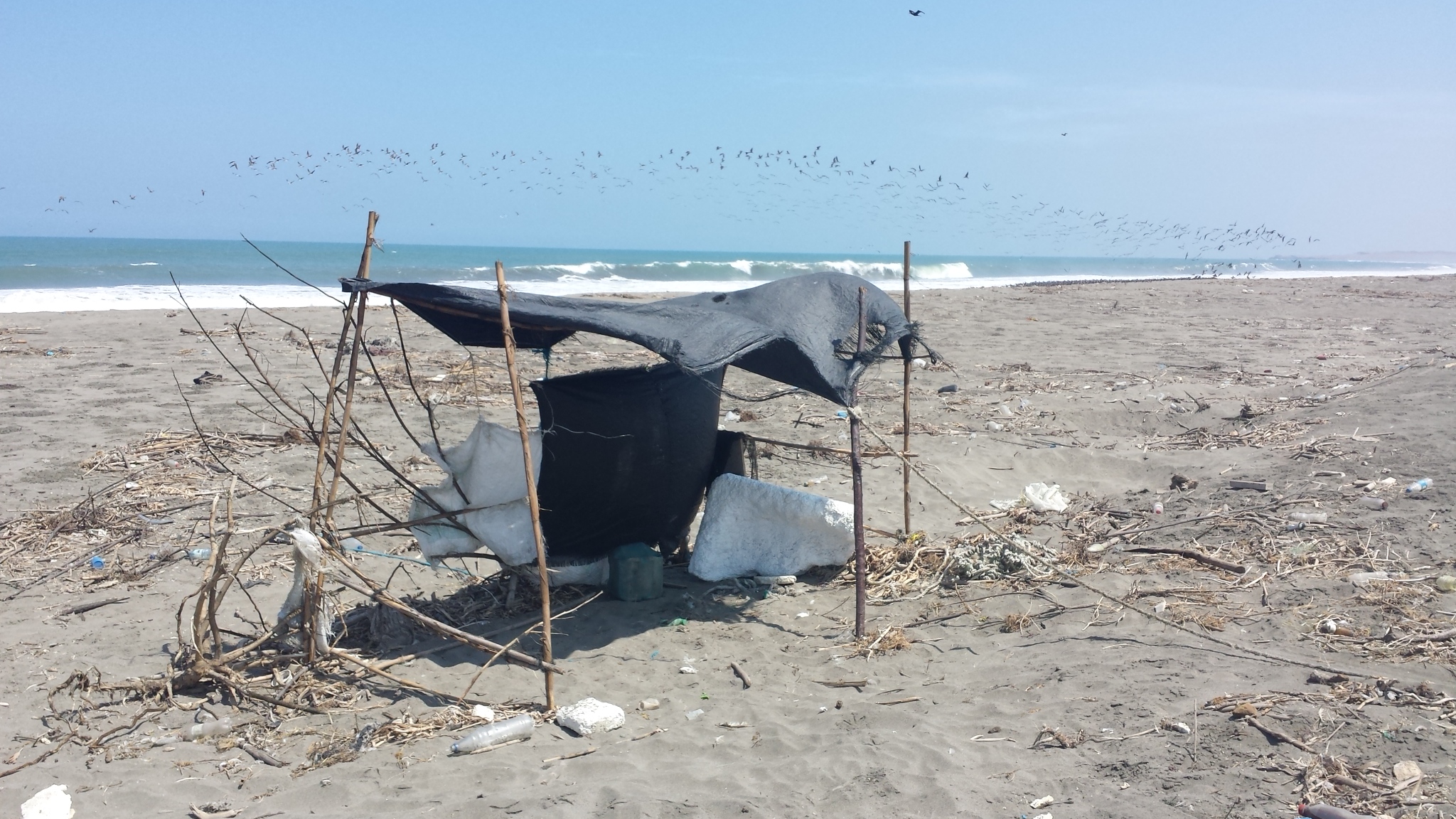 There was a beach shelter or temporary camp of a fisherman. We usually find something interesting at Medio Mundo, but today it was mostly debris. There were quite a few dead sea birds. We often find dead animals here, this time there were no dolphins. It may be a seasonal differences. Sea birds die right before migration north begins, and dolphins die at the end of the winter in November and December.