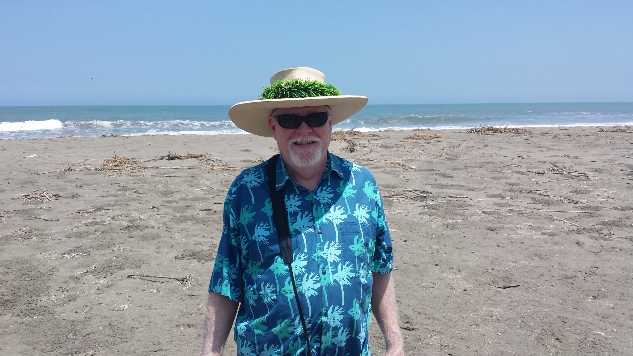 Jonathan did manage to add a decorative touch to his hat. It goes with the aloha shirt. He’s been an ace beachcomber lately. On our beach he’s found two sets of keys just in the past week. Now that we’ve given up on seashells because we have so many, we still look for “things”.