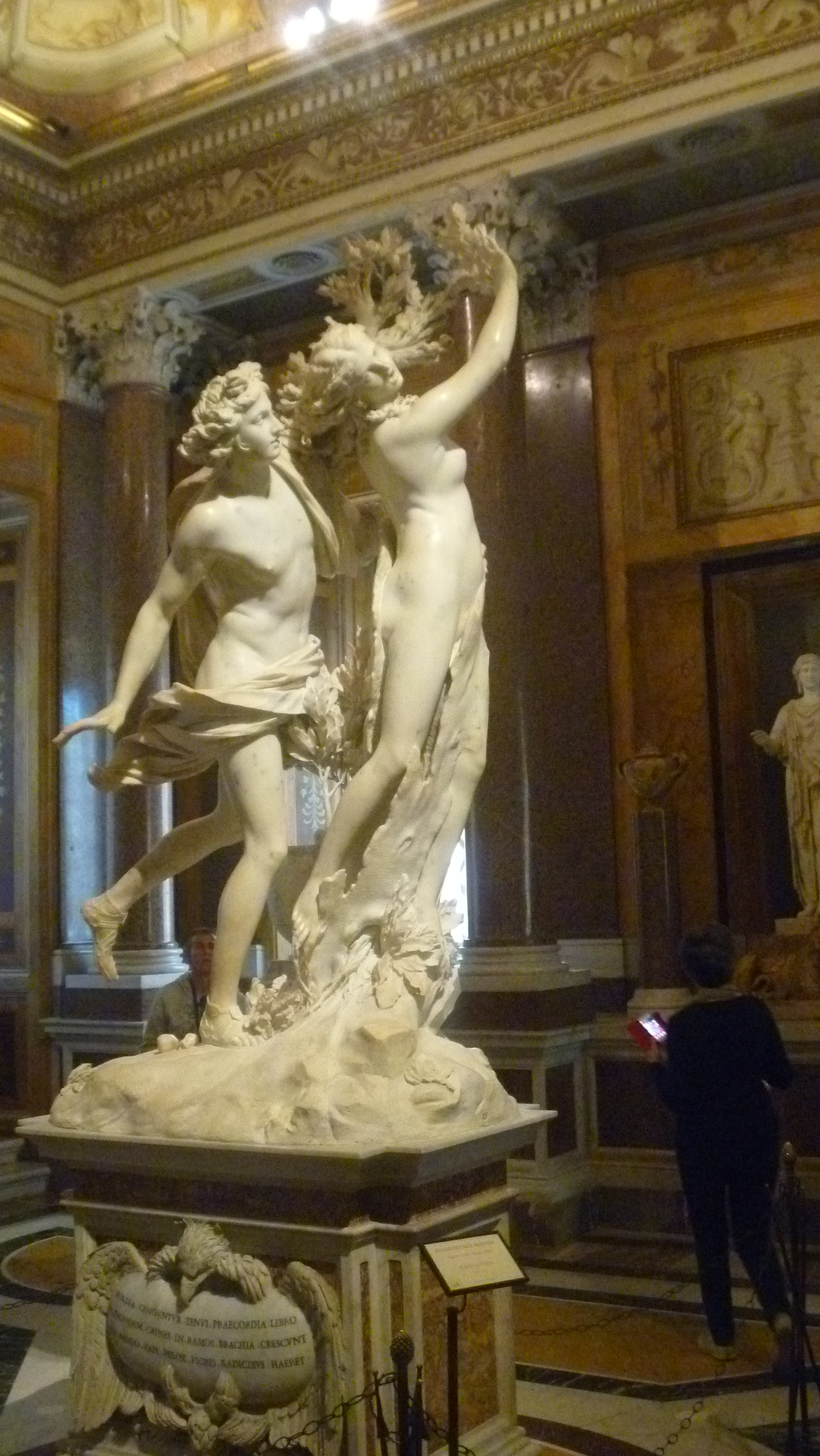 A la izquierda Eneas escapa de Troya llevando a su padre al hombro. A la derecha está la Verdad Desvelada por el Tiempo. Pero la escultura de Bernini que más me gustó fue Apolo y Daphne. Una virgen dedicada, trata de escapar de Apolo pero él la atrapa. En ese momento, grita pidiendo ayuda a su padre el dios del río, que la transforma en un árbol. Bernini capta ese momento en mármol, con hojas delicadas emergiendo de los dedos de Daphne, los dedos de los pies y el cabello.