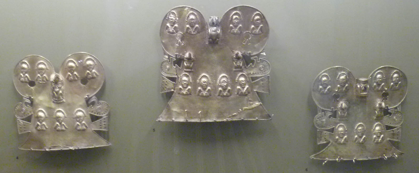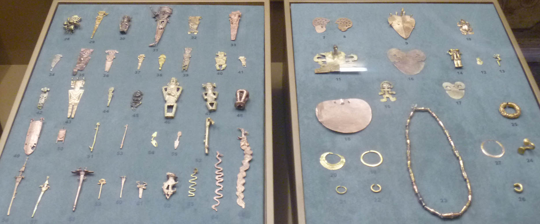 These are gold crowns from the ancient Muisca of Colombia, below are objects from the Muisca and Sinú. Some of these pieces may have reached the Vatican from the hands of the earliest explorers, Ojeda, Balboa, Pedrarias Davila, or the clerics who accompanied them. These men originated the myth of Eldorado (the golden land) in the New World. You can see history passing from the hand of one person to the next.