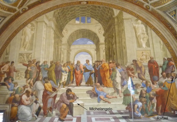 En segundo lugar solamente a la capilla de Sistine están las habitaciones de Rafael, paredes pintadas en los cuartos privados de su patrón papa Julius II. Rafael dibujó y pintó toda una habitación y el comienzo de la segunda habitación, terminada por sus estudiantes después de su muerte. Rafael y Miguel Ángel eran contemporáneos pero opuestos incluso en vida y muerte. Rafael (1483-1520) murió a los 37, Michelangelo (1475-1564) a los 89. Rafael incluyó a ambos hombres en uno de sus paneles en el Vaticano, la Escuela de Atenas, en representación de la Filosofía.