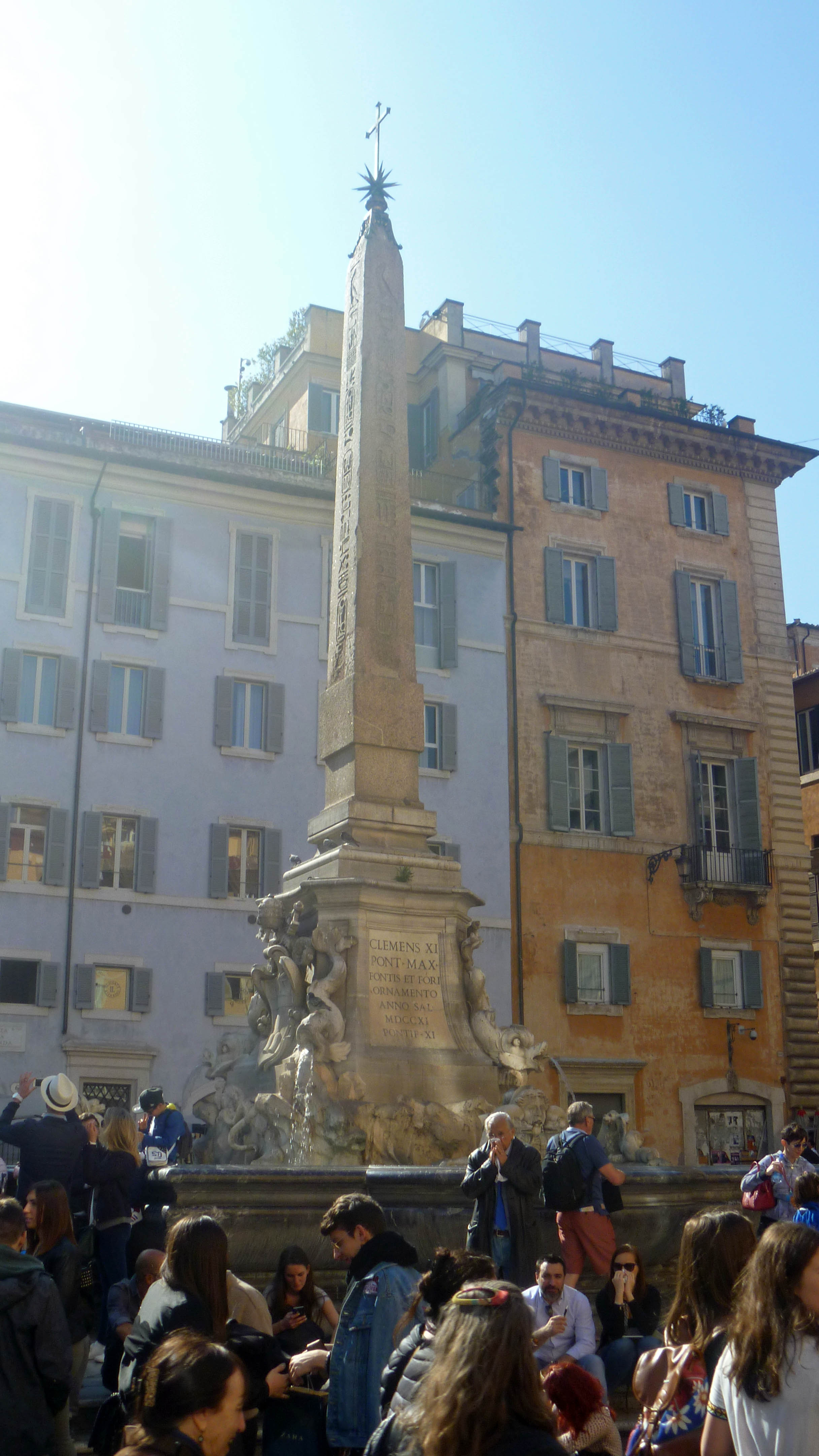 This obelisk was added to the fountain (1575) in 1711. It is inscribed to Ramses II (the Great). The photo was taken during the March for Science. This obelisk was formerly in the Temple of Isis in Rome.