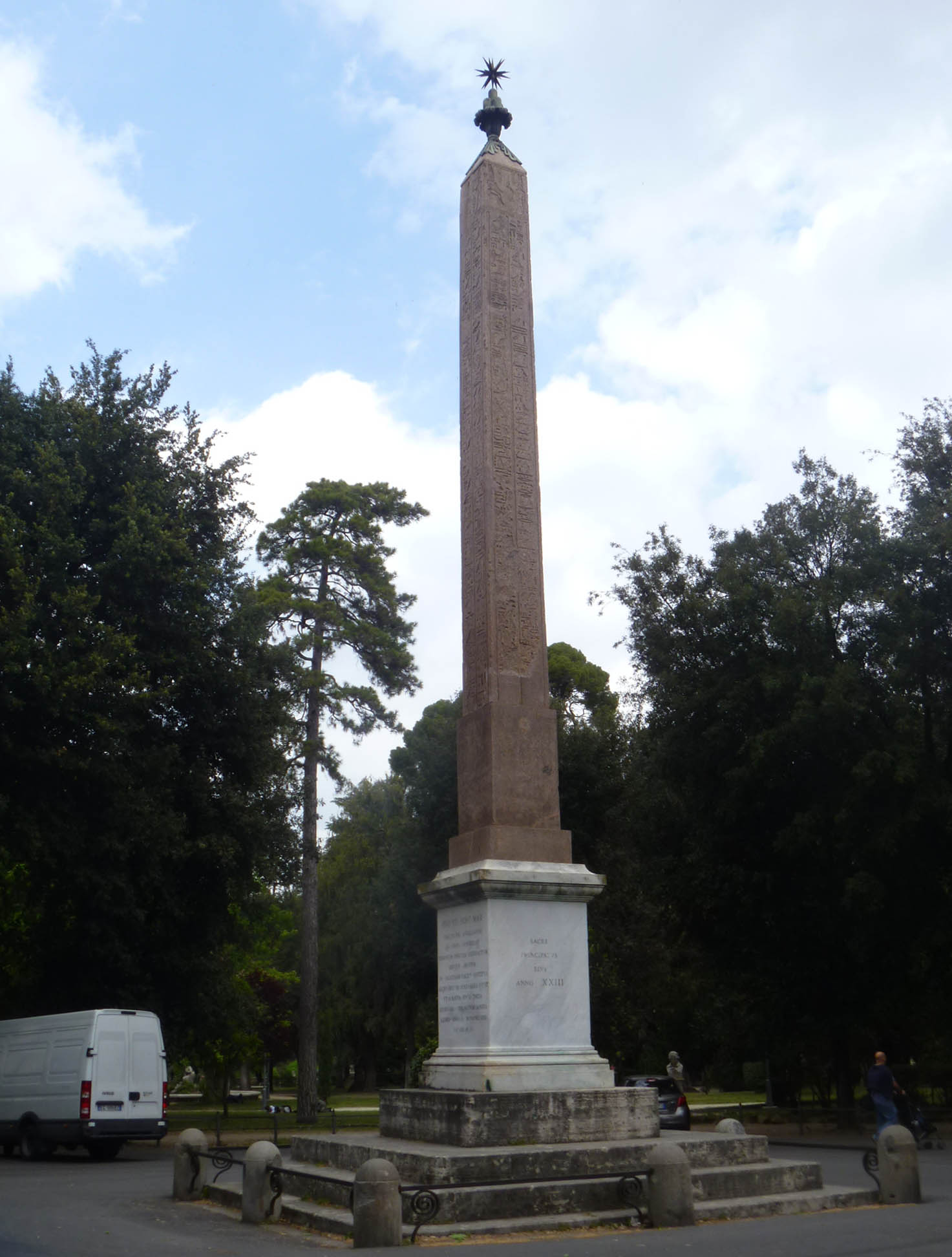 Placed in Piazza Bucharest (Viale del Obelisco) in the Pincio park in 1822. Found in 16th c. outside Porta Maggiore,may have decorated Circus Varianus. Hieroglyphs suggest it was originally erected by Hadrian on the tomb of his lover Antinous, who drowned in the Nile in AD 130. Transported from Egypt by Heliogabalus in the 3rd c. AD.