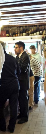 Pueden tomar otro café o dos por la tarde, de pie. Al final del día, muchas personas paran en su camino a casa, posiblemente reunión de la familia o amigos para una bebida. Incluso pueden decidir seleccionar un plato de antipasti – hay sabores muy interesantes en algunos bares incorporando cosas deliciosas como anchoas, camarones, prosciutto, alcachofas, aceitunas, incluso un poco de trufa. Un plato de estos y una copa de vino o un “spritz” (aperitivo, prosecco, soda club, hielo), puede hacer una cena ligera. PERO, todo está comido de pie.
