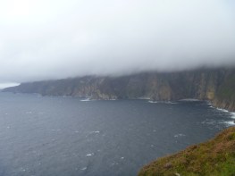 ♣ Weather can get in the way of your views. We visited the Slieve Lieg, also called the Cliffs of Bunglass, some of the highest cliffs in Europe, but the top was in fog. The top of these cliffs is usually in fog, though they are still worth visiting. This is also true of Benbulben, a distinctive feature of the landscape between Sligo and Bundoran. Still worth visiting.