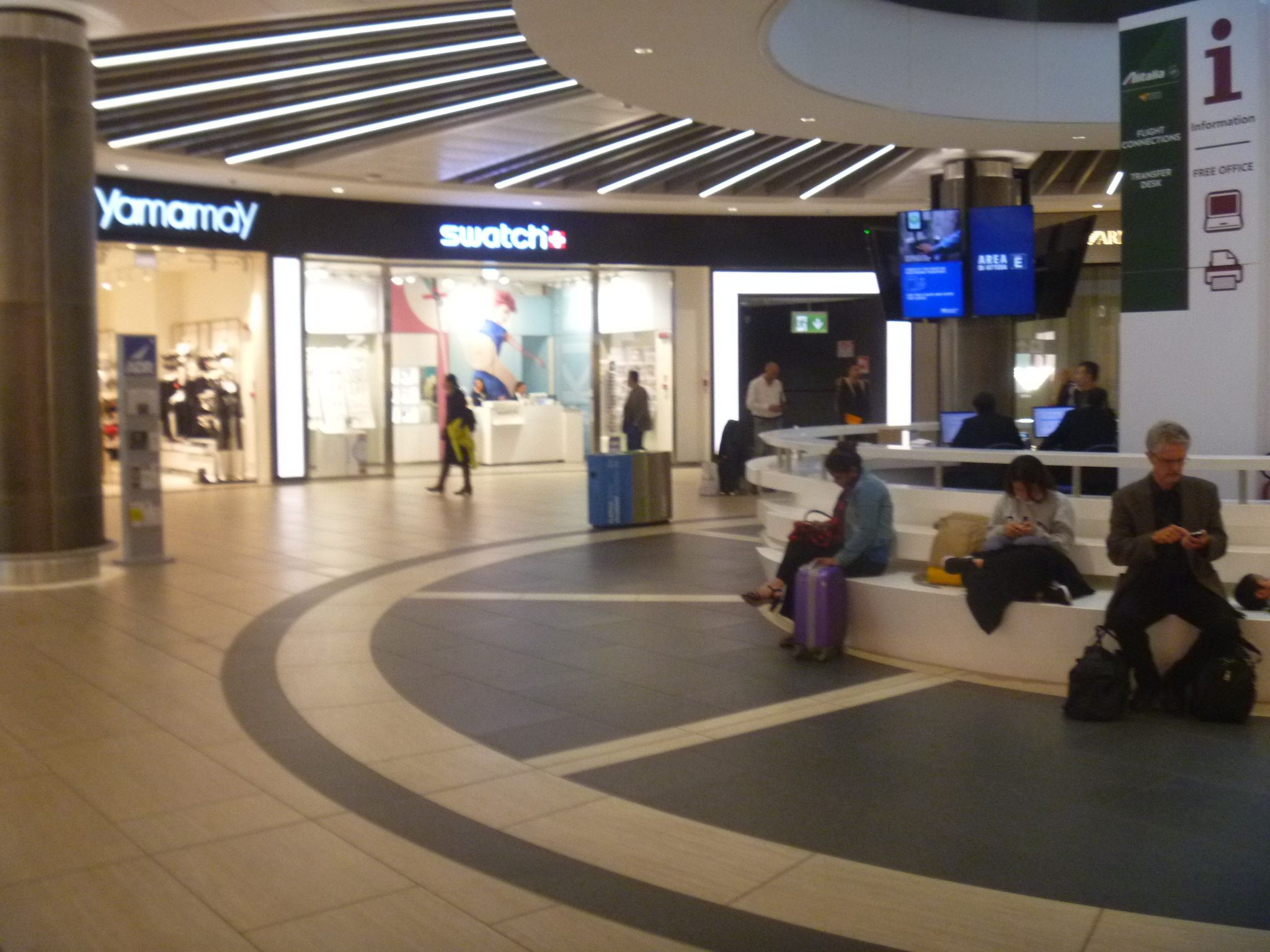 We were told at one desk that there is no bookstore in the airport any more. We passed three shops selling books after that. We were given directions to the Alitalia preflight lounge by three different people and hunted all along the terminal, finding only one sign for the lounge–outside the door. There are a few convenience stores that sell overpriced souvenirs, so we were able to get a couple of things, but be sure to do your shopping before you get to the airport unless you want a new Swatch, a Montblanc pen, or Tumi luggage.