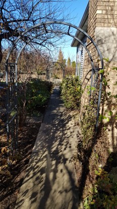 Even in November when her army of tiny Japanese maples have lost their brilliant red leaves, there is lots to see. A few brussels sprouts and some hardy kale hang on despite the bouts of cold weather that have already passed. Arches and walkways lead to hidden nooks. The sun lights the plants and makes the leaves translucent. It is a pleasure to visit and walk through. Somehow I relax just being there.