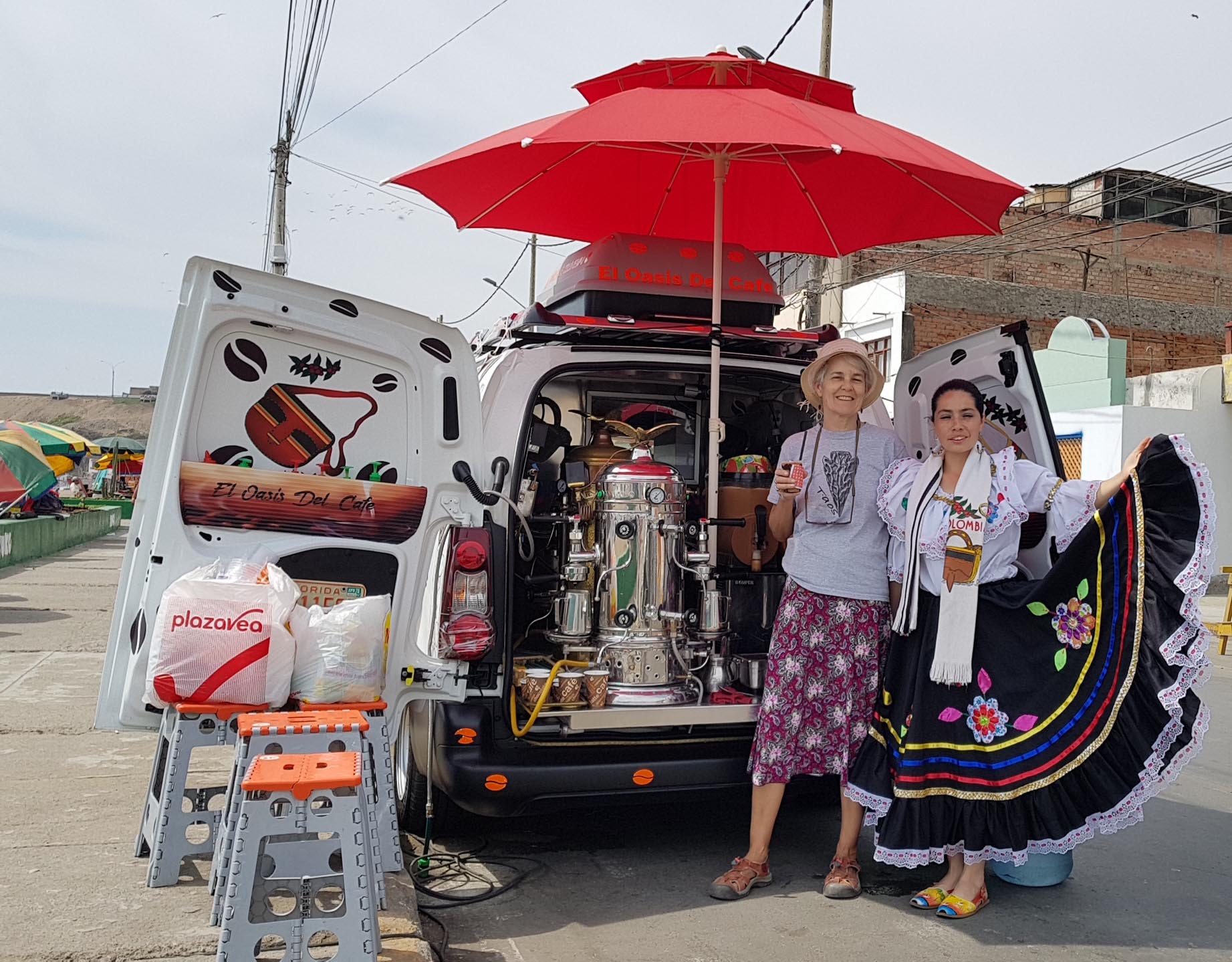 My horizons are a bit smaller in Barranca than elsewhere, since my universe is my neighborhood. It was pretty exciting to have a new food truck cafe. A pleasant Colombian couple is selling coffee drinks and the back of their van has two beautiful old-fashioned looking expresso machines. The two wear traditional Colombian outfits and look dazzing compared to the rest of us.