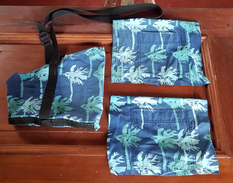 I started with the short sleeve from one of Jonathan’s worn out shirts. I folded the hem together and took the strapping from a water bottle holder that I don’t use and sewed it on to the base and tacked the shoulder strap in place.