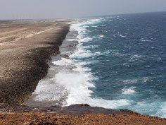 Aruba is a small island (8 x 21 mi) of volcanic rock covered with coral. The rocky coast is cut by numerous sandy beaches, though the east side of the island facing out to the Atlantic is rockier than the west side.