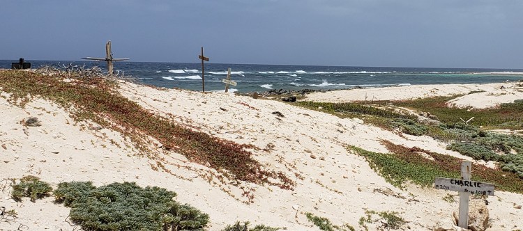We moved on to the Santana di Cacho, a beach of shelving rock that is bordered by a huge pet cemetery. When the oil refinery was working, this area was started by employees. The tradition continues. The pet cemetery beach is at the southern tip of Aruba.