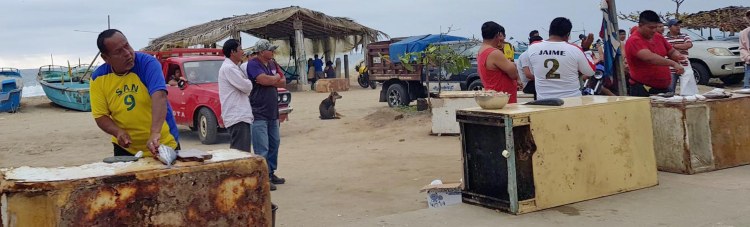 Artisanal fishing, where one or more individuals push a boat out into the ocean and spend the day fishing, then land and sell their catch, is a grueling existence. The sea can be dangerous, and yet there’s no pay if there are no fish. Fishing communities in Ecuador, like those in Peru, tend to be pretty humble places. We drove through the town of Valdivia on a Saturday and the boats had just come in, for there were fish on cutting tables right beside the street and people would pull up, roll down their window and buy fish on the spot.