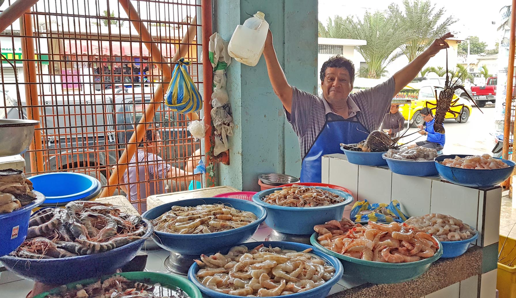 We were impressed by the quantity of shrimp at the market and found that Ecuador is one of the world’s largest exporters of shrimp along with Thailand, Vietnam, and China. Shrimp farms cover low ground near the ocean all along the coast. We found a vantage point near Playa Santa Rosa where we could see the ponds fanning out across the horizon. The good result for consumers is that at the market, shrimp cost $3-$6 a pound. More good news is that to compete internationally, Ecuadorean shrimp farms are phasing out all chemicals. This gives their product an edge over Asian growers, at least for now.