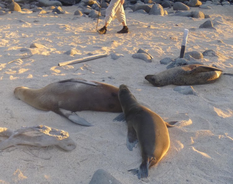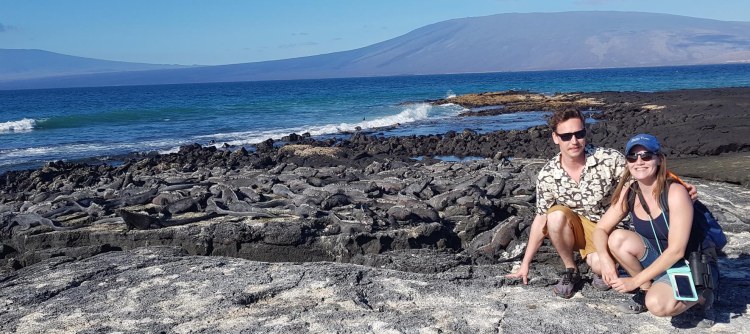 What makes the Galapagos strange is not the variety of birds and animals. Most are familiar. Pelicans, cormorants, and other seabirds are in the air, sea lions and iguanas on the beach, turtles in the water. We’ve seen these before, on beaches and in documentaries about the Galapagos. It’s their indifference to us. We ride by sea lions in the zodiacs, and we swim with them. Young sea lions are curious about us and circle as we snorkel, they dive and approach, they hang upside down, even blowing bubbles in the faces of some lucky swimmers. The sea lions flop around in the surf while we stand in the water only a few feet away, they loaf on the rocks as we hike along the beach trails.