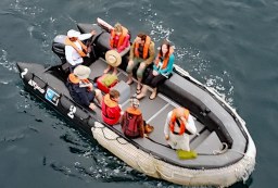 p a hand to be collected by the boatman. We swim toward the zodiac, the ladder is lowered. We hand in our fins and climb out of the water, get a towel and sit on the black rubber surface, enjoying the heat it has absorbed from the sun. We may sip from our metal water bottle as we wait for the others.