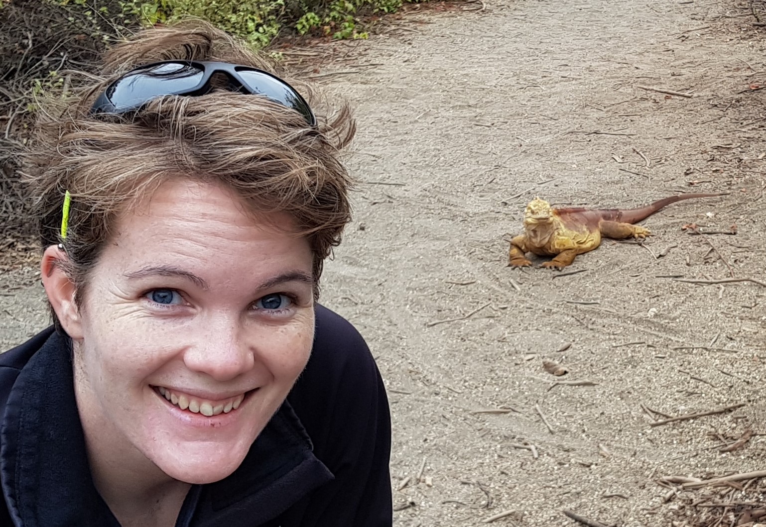 The largest tropical fish I’ve ever seen swim around and below the turtles and sea lions. Some move like flocks of underwater sheep, grazing across the bottom, lazily waving their bright yellow triangular tails. Visitors may not touch any of the animals, but animals may brush against visitors and that’s a bit unnerving. What happens when a turtle wipes their shell on your chest, or kicks you? Do we want to swim along with marine iguanas?