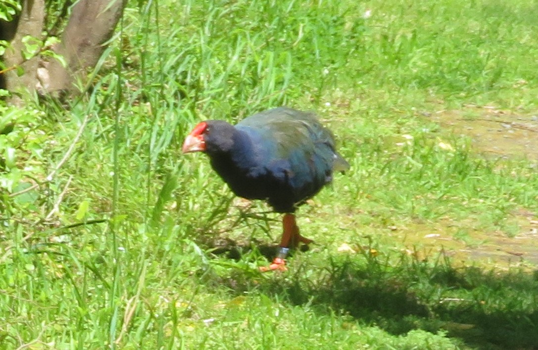 Arriving at sea level with about an hour left before our return trip, we strolled the paths through wetlands and along the shore. We heard a slight noise behind us and turned around to find one of the other rare birds, the takahe, a giant red-nosed chicken. Not a chicken at all, it is a flightless bird native to New Zealand that looks like an overgrown version of a purple gallinule. Takahe are rare, and we thought we would not see one, yet there it was. It bobbed in and out of the trees beside the trail, a happy surprise.