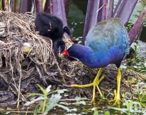 When we first saw a purple gallinule in Europe, we were amazed. So purple! So red-beaked! In New Zealand, purple gallinules roam farm fields like stray poultry. We even saw one crossing the road with two fuzzy black chicks. We are having a lot of fun with birds, and good fortune, too. Part of this is because we are here during nesting season. We’ve seen brown-speckled blue eggs in the nests of black-backed gulls, and watched a pair of chicks of the endangered New Zealand dotterel follow their mother along the shore. Dotterell nests on public beaches are carefully fenced off and very clearly visible. Seeing the chicks was a bonus.