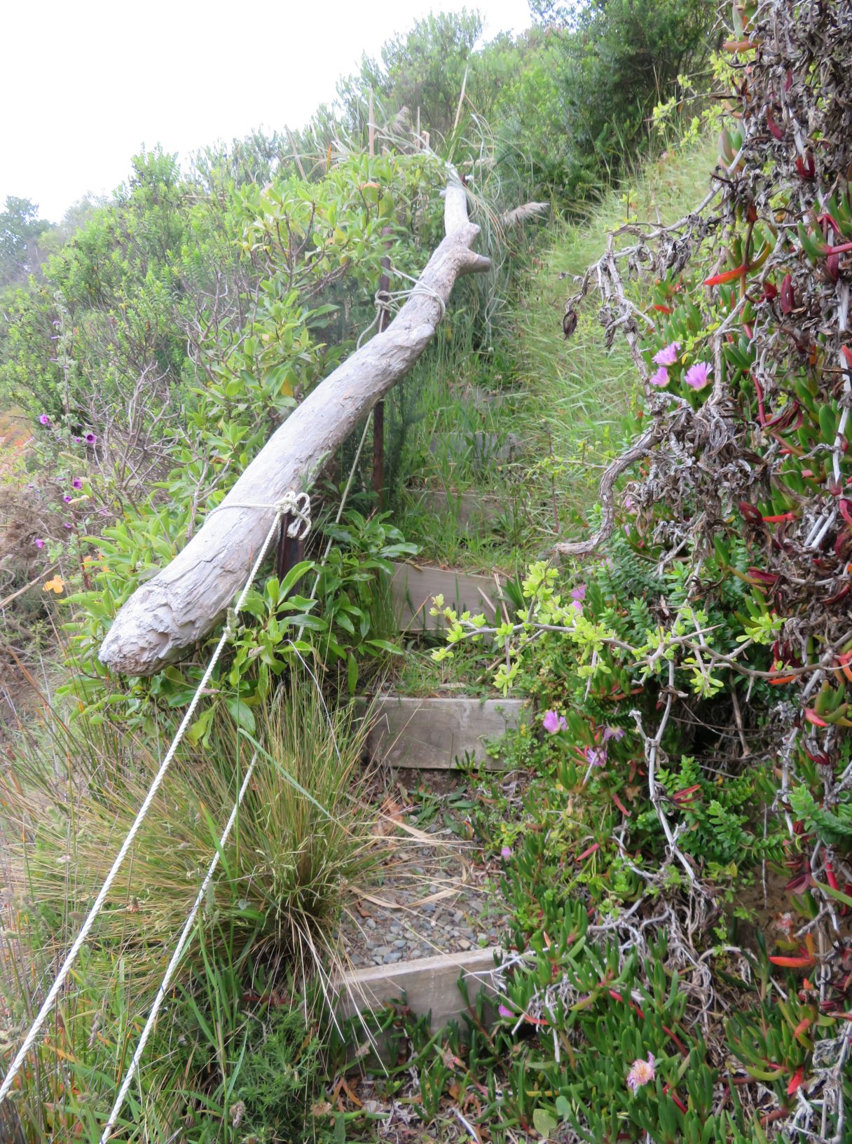 We face northeast with a view up the coast and out over the Pacific, called the Canterbury Bight. Looking over the edge of the cliff, we spotted a spherical boulder eroding out of the shore, part of the deposits extending over 15 km from here to the opposite side of the bay. There the Moeraki Boulders are one of the tourist sites of this region. We have a few in our yard, along with a limestone bathing beauty hiding in the bushes.