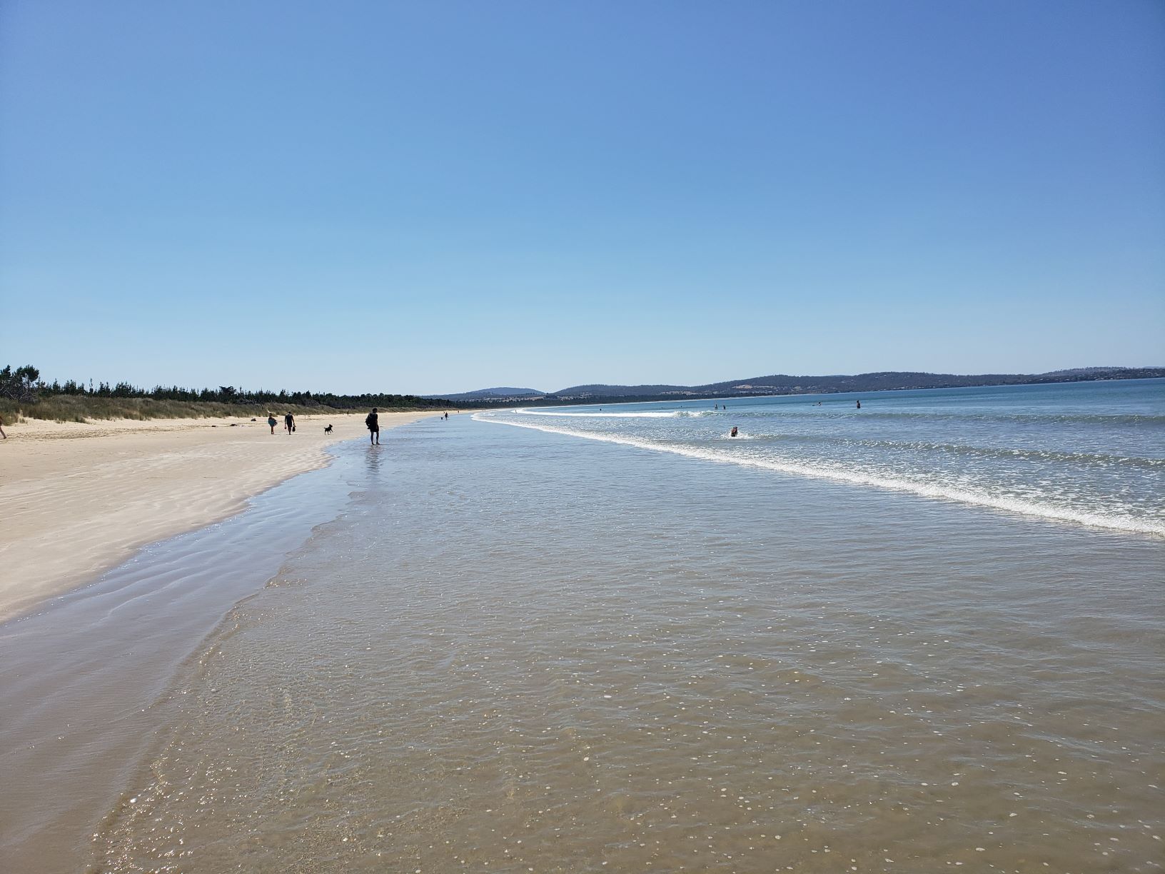The next morning the forecast was for hot, hot weather and we headed for Seven-Mile Beach, just north of Hobart. Arriving midday, the sand was too hot to go barefoot, so we scuttled down to the tide line and took a long walk splashing in the shallows. Lots of people were on the beach under small tents or umbrellas and we strolled toward the end of the line. Not having a tent, we perched our bags on the edge of the sand and went for a dip. It was perfect, cool water and flat seas, barely a tiny wave to ride in on. We got out planning to find shade for a picnic, when a cloud covered the sun for a moment.