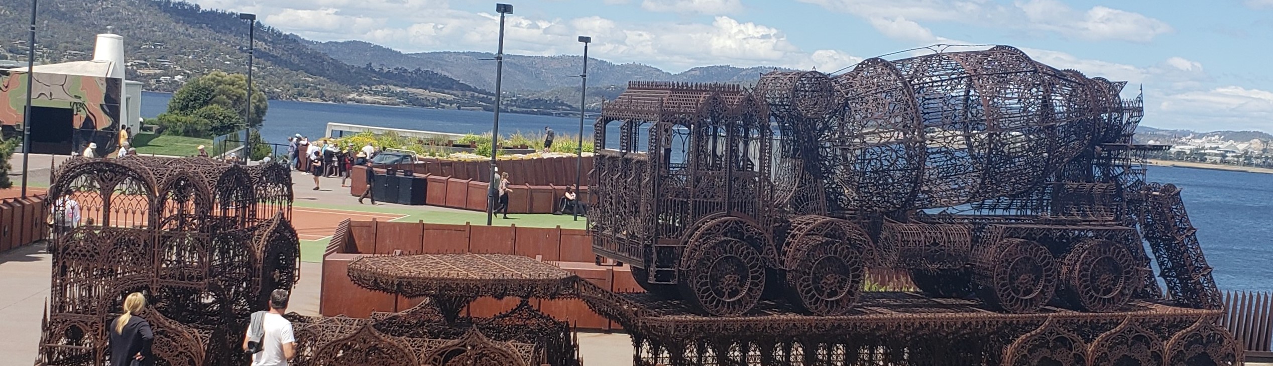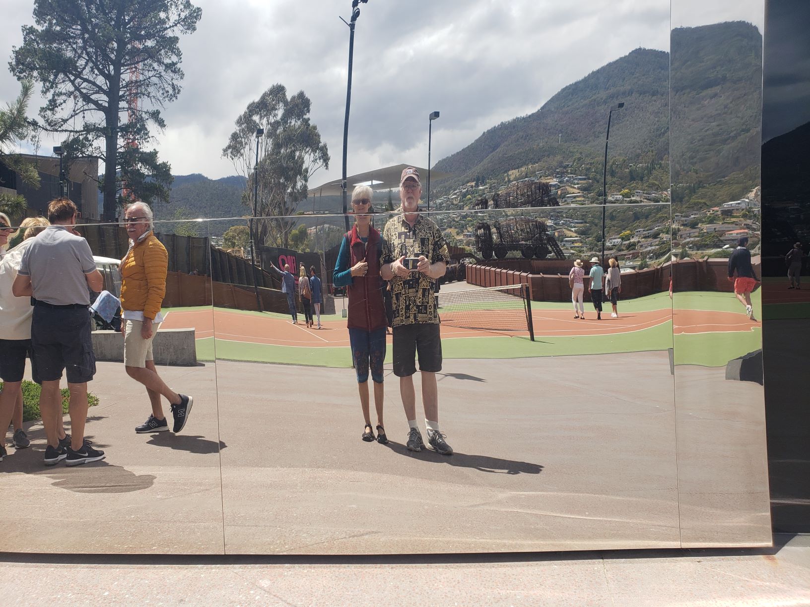 MONA is a new phenomenon just outside Hobart, a huge museum meandering up and down over three floors built into the side of a hill. Visitors arrive via ferry from the city, getting a great view of the Derwent River and the MONA facade as they arrive. Drivers walk down a path beside a band shell and lawn, past a barbecue restaurant and bar, the entrance to the Moorilla winery that is part of the property, and if they’re not lost yet, descend a zig-zag set of stairs and ramps to arrive at the front door of the museum. Clad in mirror-finish brass, it’s a bit disorienting, but that seems to be the point.