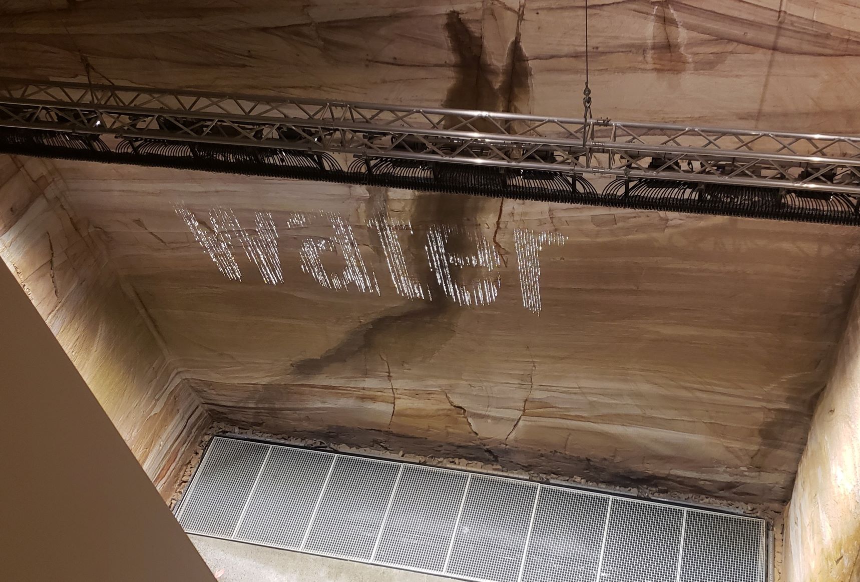 An ingenious piece emits water droplets in patterns that create words out of the falling water. I listened to an interview with the artist who revealed that as soon as he presented his piece he was besieged with requests to use it for advertising. He refused, and someone promptly worked out how he did it, creating a similar device to be used for advertising. It is already in use, with the artist gaining neither credit or money for it.