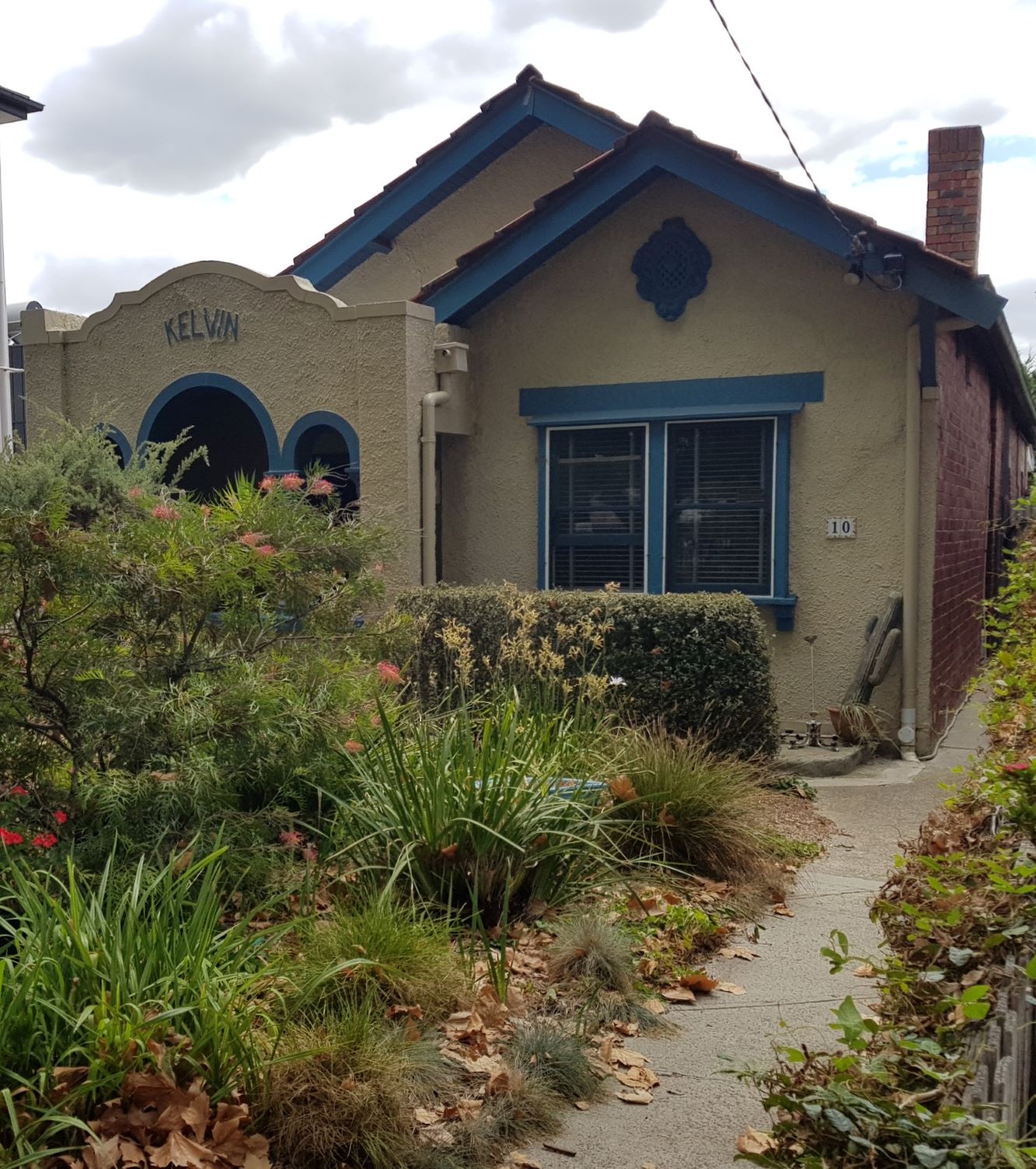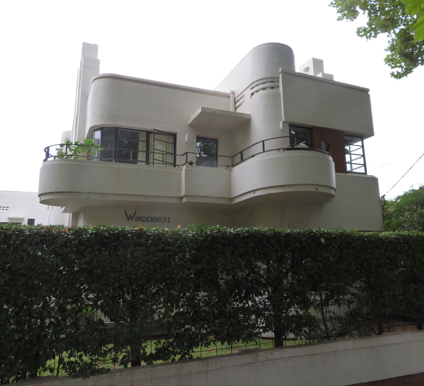 I see the upper fringe of detail on a house and am unable to take a photo that does it justice because of a brick or concrete wall that covers most of the facade. Duplexes are quite common here, and halves of houses are bought and sold independently.