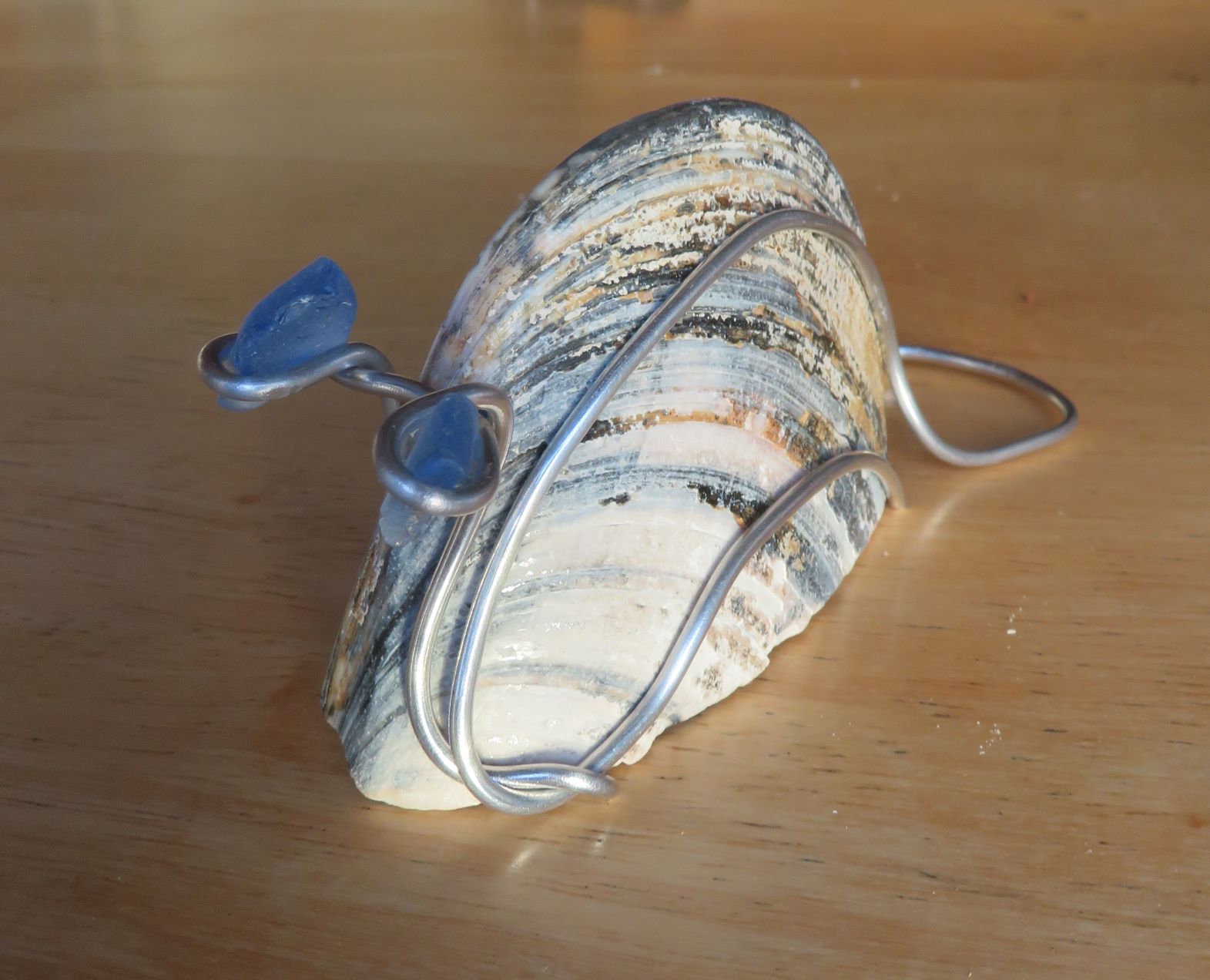 Snail, mussel shell, wire, blue glass, Aruba