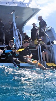 We had an early start to a long day, leaving home at 7 am for Port Douglas, arriving before 8 am. With about 40 of us aboard, the boat left port at 8:15 or so, driving out across the water so fast that waves broke against the windows while the boat rocked and pitched. It was impossible to walk across the room without clinging to the rails. During this, the staff gave us orientation briefings and described what we’d be seeing, calm as though these were everyday conditions–I guess they are. The boat finally stopped and anchored, yet we saw nothing around us other than a slight change in the color of the water and breaking waves a few hundred yards away. This was the reef. It’s not like snorkeling around the edge of an island, there’s nothing above the surface.
